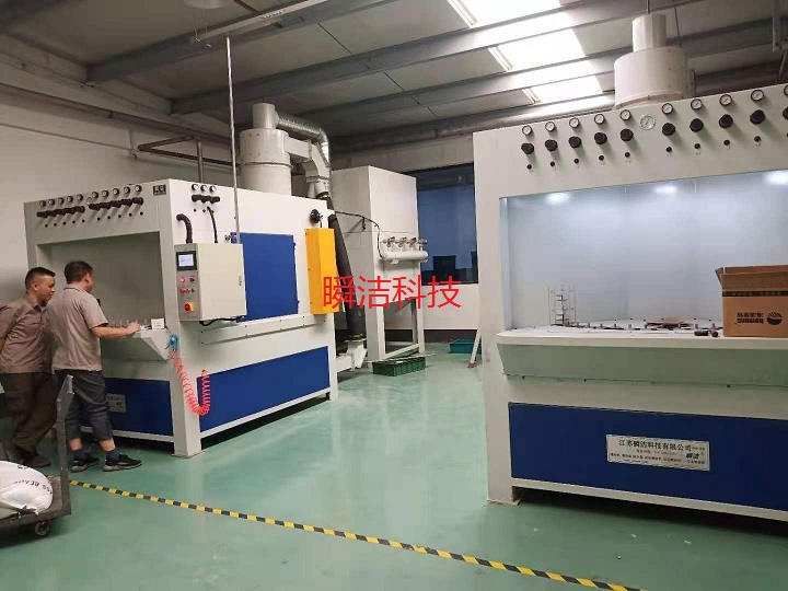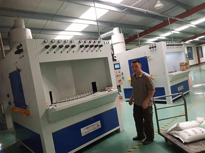 1、 本設(shè)備可采用6-12噴槍設(shè)計,噴槍設(shè)置上下兩組,噴砂上下擺動,噴槍360度可調(diào),保證產(chǎn)品表面均勻噴砂,無死角,成品率100%。